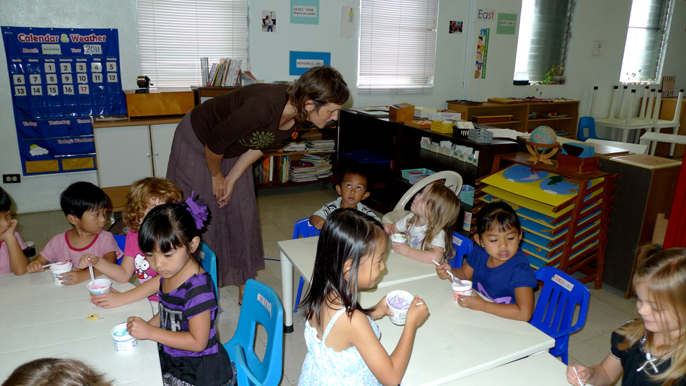 I started giving the artclasses at the Montessori school a bit later this year. I had to get into a good rhythm first. With Bas going to another school things are bit more complex. Anyway, I started with a few stories this year. One was about the experience of color, the other (seen on this picture) about mixing colors starting with the basic colors (with witches). After that they could mix their own in a bit of yoghurt and taste it. That was a lot of fun.